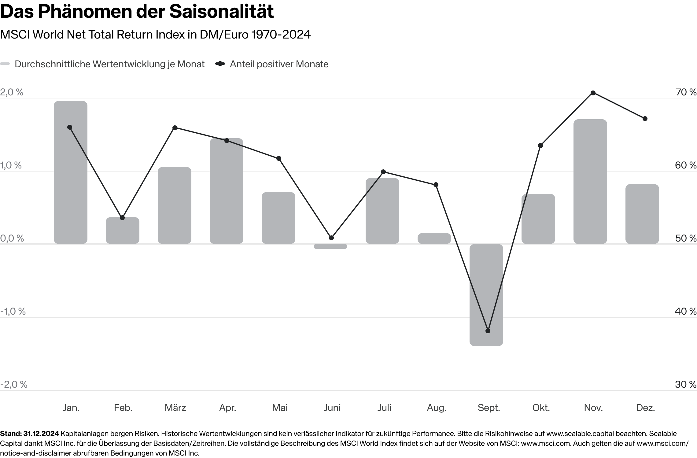 Das klingt reichlich verwegen, ist aber von der Aktienmarkt-Historie durchaus valide unterfüttert. Denn wer Ende Mai aussteigt, erspart seinem Depot den Juni – und der ist statistisch der zweitschlechteste Börsenmonat. Der MSCI World Index etwa hat seit 1970 auf DM/Euro-Basis im Juni durchschnittlich 0,1 % verloren und nur in 28 von 55 Jahren eine positive Performance geschafft (Net Total Return).