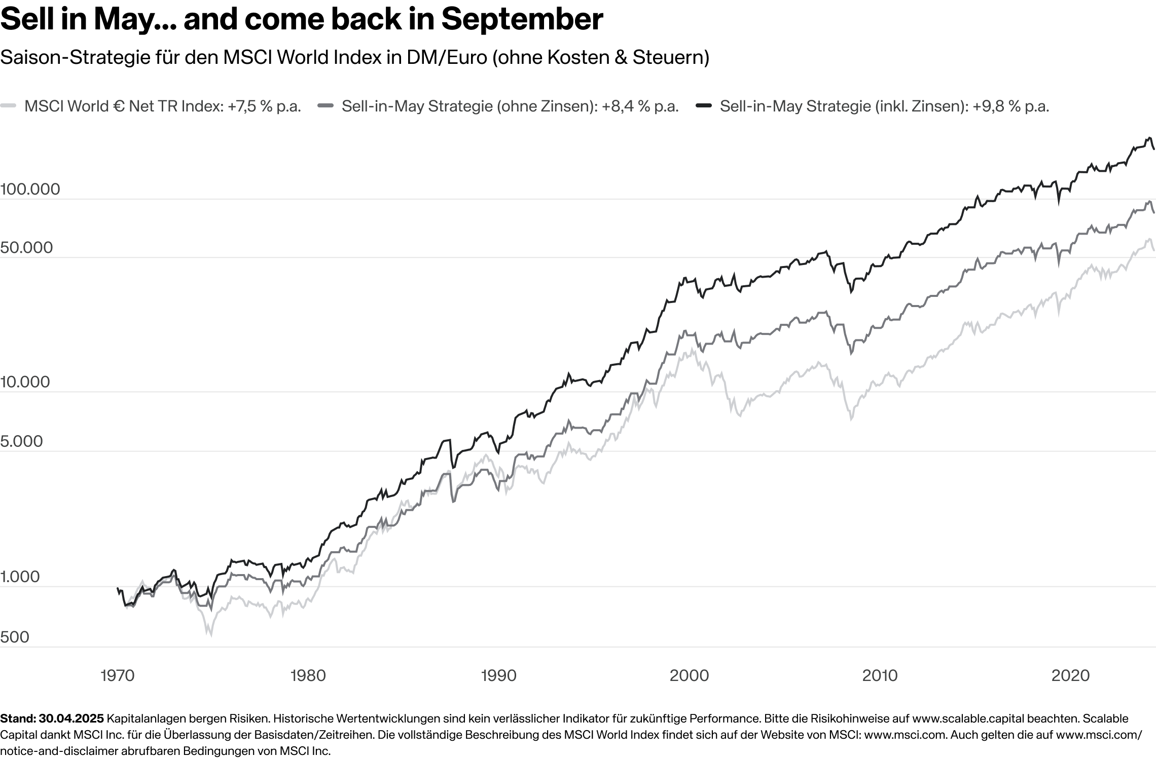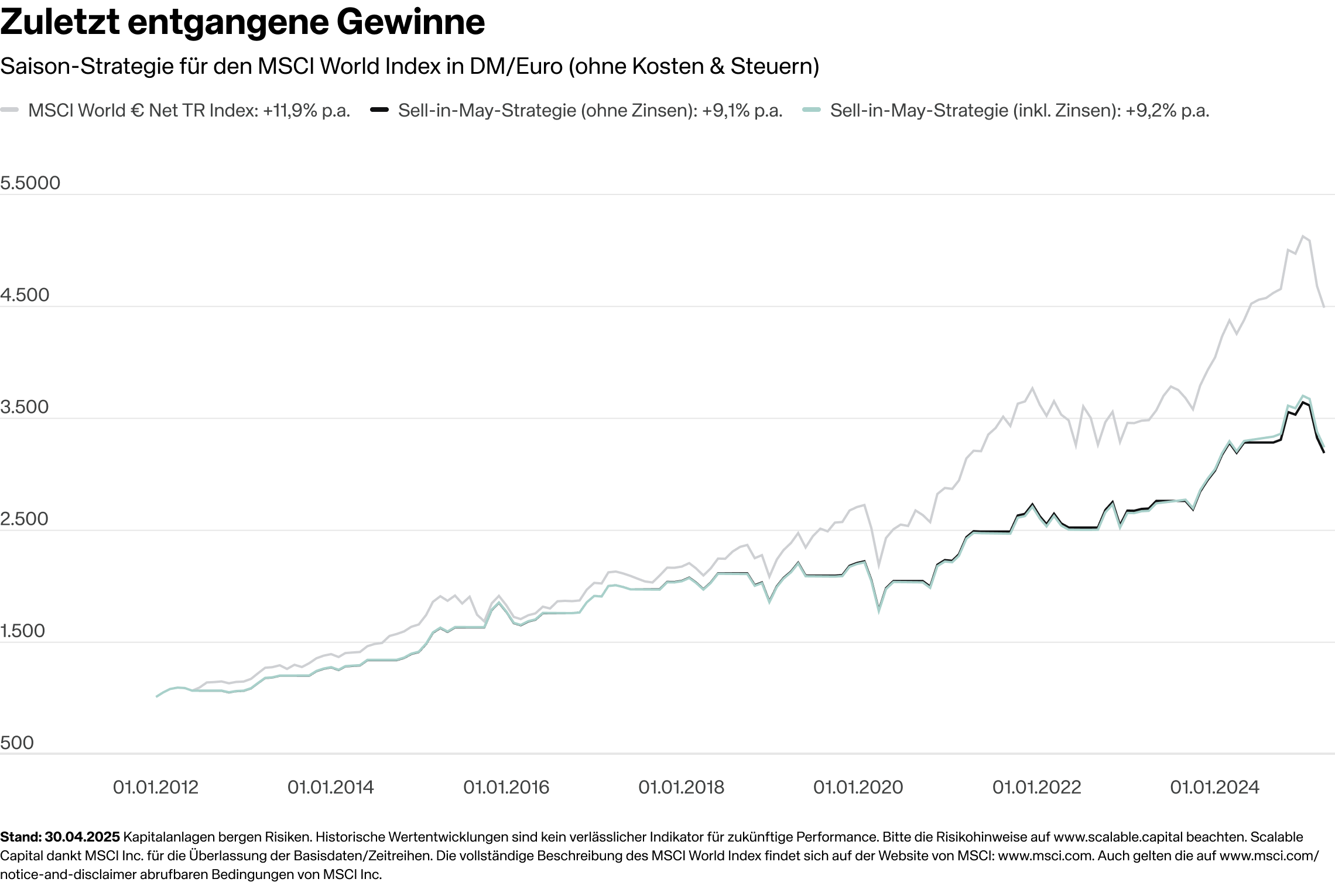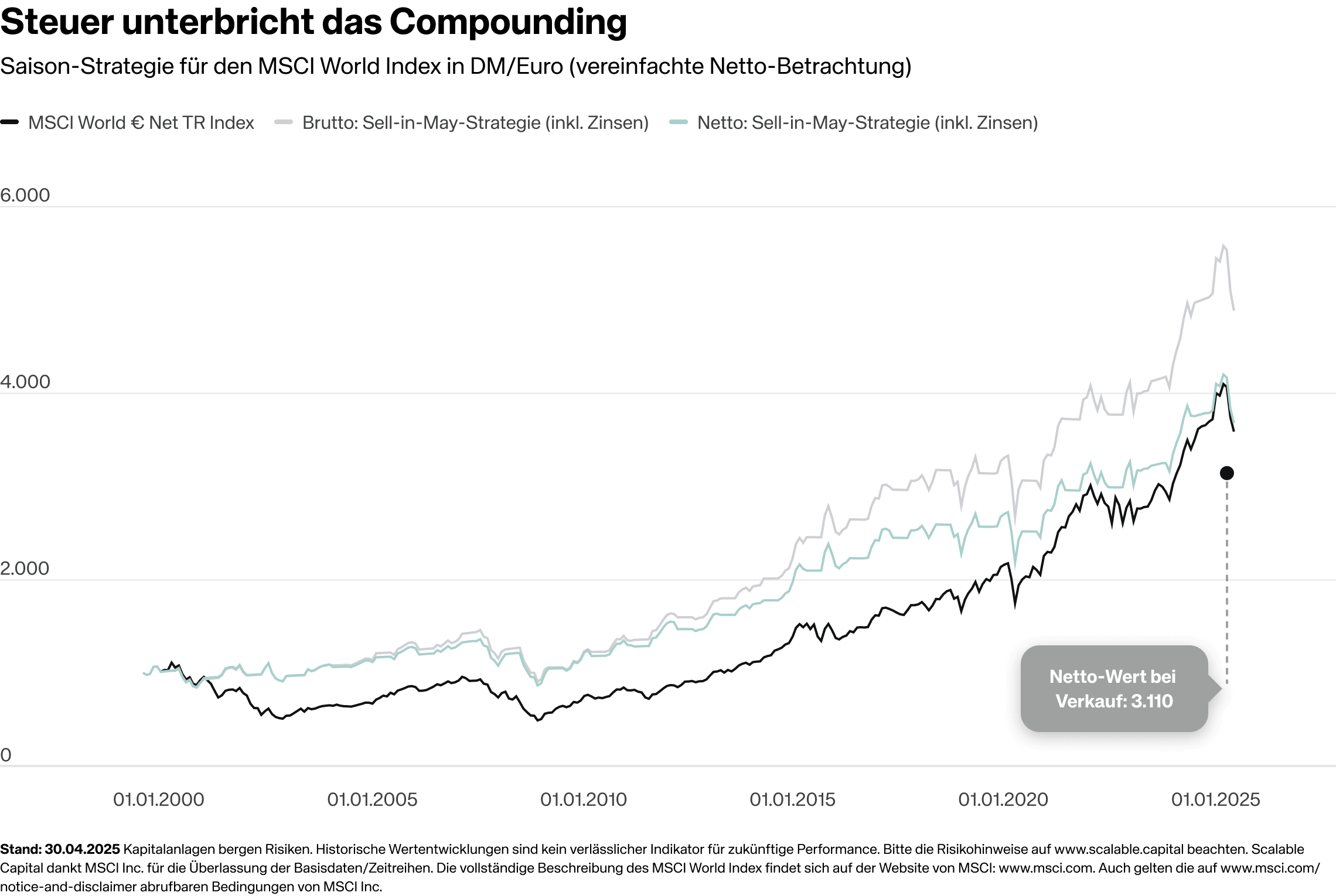 Zumal das Rein-Raus-Spiel ja doch mit gewissem Aufwand verbunden ist. Zwei Transaktionen sind zwar schnell gemacht und die Geld/Brief-Spannen sind bei den hoch liquiden MSCI World ETFs nur marginal. Aber jeder Verkauf ist eben auch ein steuerliches Ereignis – und wer von Oktober bis Mai Gewinn gemacht hat, was eben der historisch der Regelfall war, zahlt darauf (wenn der Freibetrag ausgeschöpft ist) Abgeltungsteuer, Solidaritätszuschlag und ggfs. Kirchensteuer. Und was an den Fiskus gegangen ist, steht dann vier Monate später naturgemäß nicht mehr für den Wiedereinstieg zur Verfügung. Das “Compounding” wird also jedes Jahr von Neuem unterbrochen und diesen steuerlichen Nachteil muss die Saison-Strategie erst einmal durch höhere Renditen aufholen.