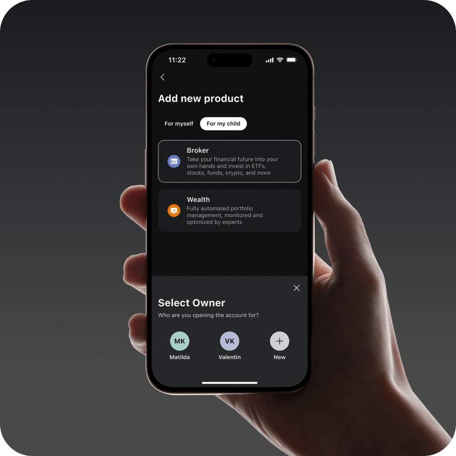 With Scalable, every Kid’s account offers Pocket Money, so you can save more for the next generation: Opt for the Broker to invest in hundreds of ETFs, without the annual fee (TER). Or choose Wealth for a fully automated portfolio at zero management fees.